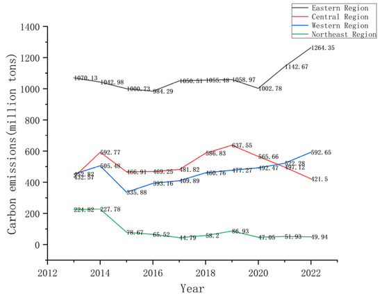 The carbon emissions of each province were categorized by region, as shown in Figure 4.