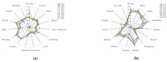 After standardizing the data from the two systems, a coupling coordination degree model was employed to quantify the coupling coordination relationship between regional development levels and carbon emissions across China. The spatial heterogeneity of these relationships is visually represented in Figure 6a,b, which provides a multidimensional comparative analysis of regional characteristics. This graphical representation effectively illustrates both the overall coordination patterns and distinct regional disparities observed in the study.