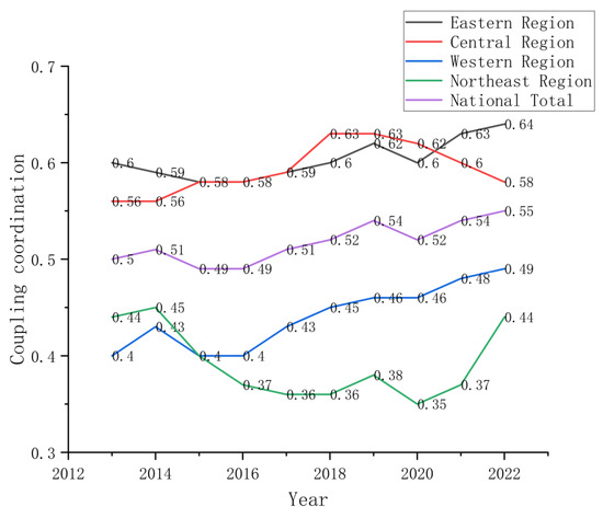 Temporal variation in construction–carbon coupling coordination trend from 2013 to 2022.