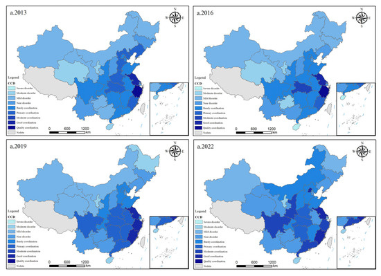 The coupling coordination degree between the construction industry’s development level and its carbon emissions was calculated for 30 provinces in China for the years 2013, 2016, 2019, and 2022. A spatial divergence map was generated using ArcGIS software (https://www.arcgis.com/index.html, accessed on 1 May 2025) to illustrate regional disparities (Figure 8).