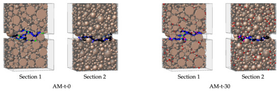 The AM–0 model is a prismatic specimen (8.0 × 5.0 × 5.0 cm3) that follows the specified dimensions, aggregate gradation, and mastic characteristics detailed in Table 1. In the assembly, particles larger than 2.0 mm represent the aggregates, while those between 1.5 and 2.0 mm represent the mastic. The AM–0 model comprises 25,374 particles, 138,573 particle–particle contacts, and 1537 particle–wall contacts. The AM–t–0 model follows the same dimensions as the AM–0 model and adopts a similar particle size distribution for both aggregates and mastic. However, the specimen includes a notch measuring 0.80 cm in length and height on both sides at mid-height to facilitate fracture initiation and localisation. The relationship between the minimum specimen width (between notches) and the maximum aggregate size is approximately 2.5, which is considered an acceptable ratio (see Figure 1 and Figure 2).