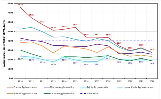 Average annual concentration of PM10 [µg/m3] in selected Polish agglomerations. Source: Statistics Poland.