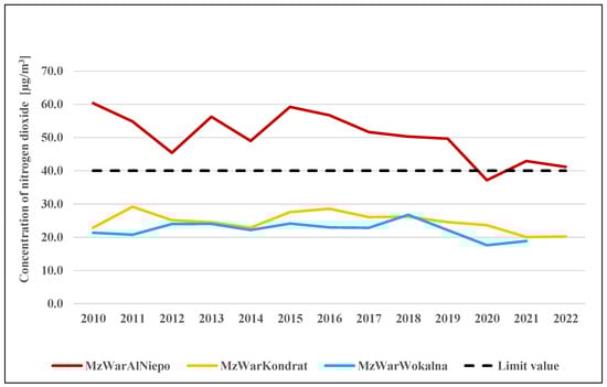 The primary pollutant emitted by road transport and point sources in Warsaw is nitrogen dioxide (NO2). The average annual concentration of nitrogen dioxide is measured at three reference air quality monitoring stations situated along three streets in Warsaw, as shown in Figure 4.