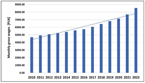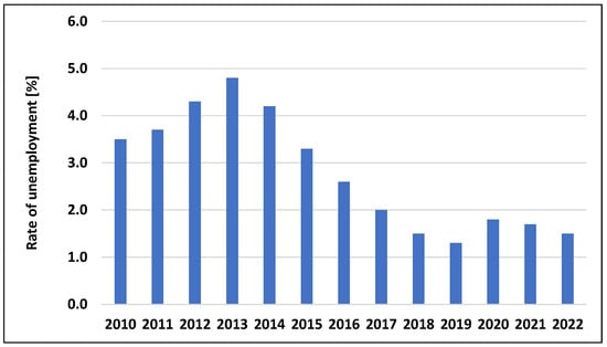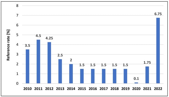 Warsaw, as the capital of a country with a population of 37 million and the largest business, transportation, and academic hub, experiences continuous growth in demand for real estate, both in the sales and rental markets. To analyze the dynamics of real estate prices in Warsaw during the studied period, it is essential to examine the local determinants of price changes. Over the last decade, favorable economic conditions have significantly contributed to the city’s development. Stable income growth (Figure 7), combined with low unemployment rates (Figure 8) and historically low interest rates (Figure 9), has led to a sharp increase in demand for residential properties. Interest rates experienced a sudden increase in 2022 because of the post-pandemic economic crisis and the geopolitical instability caused by the Russian invasion of Ukraine.