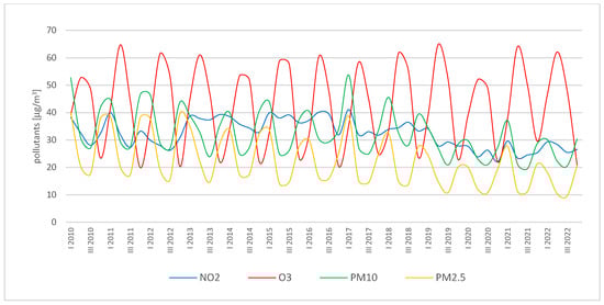 The variability in the obtained pollutant concentrations (Figure 12) indicates strong seasonality in annual cycles, particularly for ozone and particulate matter PM2.5, and less so for particulate matter PM10, especially since 2018. Changes in nitrogen dioxide concentrations do not show clear seasonal patterns.