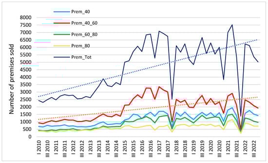 The total number of residential properties sold in Warsaw (Figure 13) from 2010 to 2013 remained at 2500–3000 per quarter, and from 2013 to 2016 it increased to around 5500–6500 transactions per quarter. This level remained relatively stable until the end of the observed period. The total number of residential properties sold (‘Prem_Tot’) refers to the primary and secondary markets combined. The growing demand for residential properties in Warsaw is evidenced by the steady increase in the number of units sold (Figure 13), which, as previously indicated, is characterized by significant seasonality. Residential properties in Warsaw are purchased for both private use and investment purposes, such as resale or rental (capital investment).