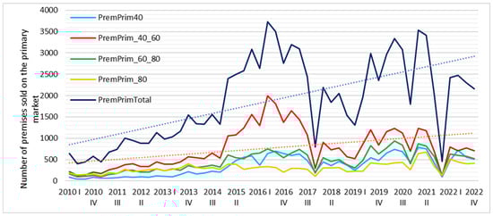 The volatility of the number of flats sold on the primary market (‘Prim’) in 2010–2012, in total and by segment, is presented in Figure 15. From 2010 to 2014, the volume of flat sales on the primary market grew steadily from approximately 500 to around 1500 units per quarter. From the end of 2014, there was a period of intense growth, which peaked in mid-2016 at 3700 units. The following 18 months saw a period of intense declines in sales in the primary market, and by the end of 2017, the level of 2011 was reached below 800 units. The subsequent years saw a recovery in sales volume to another record level of over 3400 units in the second quarter of 2021, followed by the sharpest decline in the analyzed decade, to 460 units in the fourth quarter of 2021. Throughout the analyzed period, residential properties with an area of 40–60 m2 accounted for the largest share of sales, while the smallest share was held by the largest flats, i.e., those with an area exceeding 80 m2, from 2015 onwards.