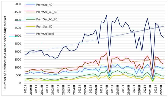 On the secondary market (‘Sec’), similarly to the primary market, the total number of residential properties sold in the analyzed period showed an upward trend, although the rate of change was more moderate and the number significantly higher (Figure 16). From 2010 to 2014, the total volume of residential property sales on the secondary market grew from approximately 1750 to approximately 2600 units per quarter. Since 2015, the rate of change has accelerated, continuing the upward trend. In the fourth quarters of 2016, 2017, 2020, and 2021, there were sharp but short-lived declines in sales and a rapid return to levels between 3000 and 4000 units per quarter. The structure of apartment sales by segment remained relatively consistent throughout the entire period analyzed. The largest share was held by residential properties with an area of 40–60 m2, followed by those up to 40 m2, while the smallest share was held by the largest apartments, i.e., those over 80 m2.