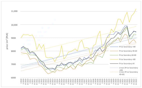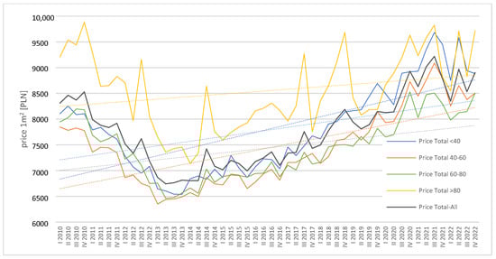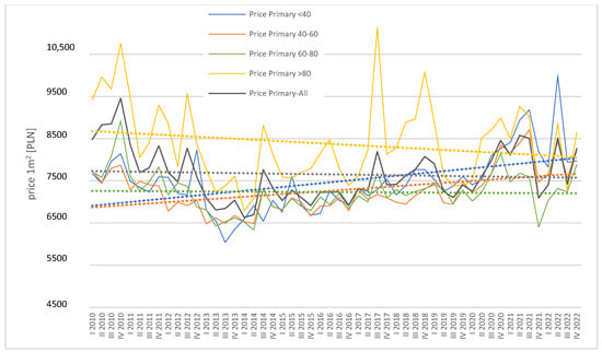 During the analyzed period, prices per square meter of residential properties on both the secondary and primary markets showed significant volatility, primarily due to macroeconomic factors such as GDP, inflation, interest rates, and government housing policy. In 2010–2013, both markets and all segments recorded a decline in prices per square meter of residential properties (Figure 17 and Figure 18), which was due to the deterioration of the country’s economic situation following the global crisis of 2008–2009. However, since 2014, there has been a gradual increase in prices per square meter of residential space in both markets and across all segments, apart from the largest dwellings—those with an area exceeding 80 square meters in the primary market. For this segment, prices exhibited significant volatility, ultimately forming a downward trend throughout the analyzed period. In contrast, in the other segments, both on the primary and secondary markets, long-term trend lines show an upward trajectory.