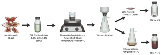 The independent variables considered for extraction, defined by the experimental design, are presented in item 2.4, Table 1. Whole seeds of annatto in nature (0.5 g) were subjected to maceration with 5 mL of SFS in different concentrations (0.5, 1.0, and 1.5%), for 30, 60, and 90 min, under magnetic stirring (400 rpm) at temperatures of 40, 50 and 60 °C (Ika MAG HS 7). After maceration, the solution was vacuum filtered using a filter (Whatman paper No. 2, 90 mm, Cytiva, Marlborough, MA, USA). The seeds were separated, and the solid material retained in the filter was stored in amber glass, protected from light, and placed to dry in an oven (35 °C, 24h). After this, this sample was named a solid extract of annatto seeds from SFS (SEAS + SFS). The filtered solution was stored in amber glass, protected from light, and refrigerated (4 °C). This sample was named a liquid extract of annatto seeds from SFS (LEAS + SFS) (Figure 1). Subsequently, the samples were subjected to UV-Vis analysis to quantify the bixin content.