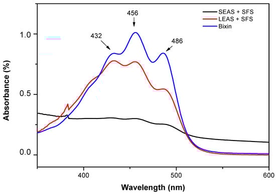 The conjugated double bond system in bixin constitutes the absorption chromophore above 400 nm (Figure 2). The absorbance spectrum for the standard bixin, solubilized in ethanol, showed peaks at 432, 456 and 486 nm. The SEAS + SFS sample showed an absorbance profile similar to that of the standard bixin (Figure 2), while the LEAS + SFS sample showed lower absorbance values at λ Max (Figure 2), which is in agreement with the results of [41], who reported that bixin has a higher affinity for polar solvents.