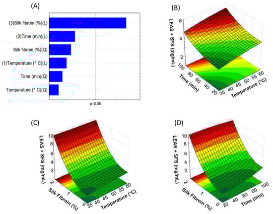 To enable factor-response analysis and understand the relationship between the variables in the data set, from the collected results, a Pareto chart and response surface were generated for all variables, to determine the significance of the influence of the factors (SFS concentration, temperature, and time) on the bixin content in LEAS + SFS (Figure 3) and SEAS + SFS (Figure 4).