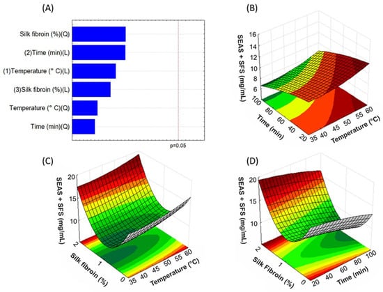 Regarding SEAS + SFS, none of the factors (SFS concentration, temperature and time) significantly influenced the 95% confidence level for the bixin content response (Figure 4A).