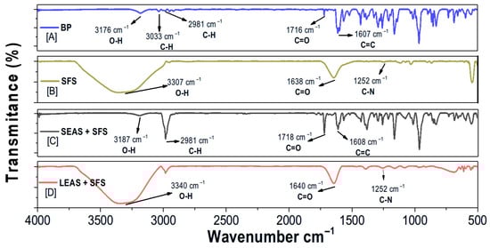 The SEAS + SFS spectrum (Figure 5C) exhibited vibration bands similar to those in the PB spectrum, such as 3187 cm−1 (O-H of the COOH group), 2981 cm−1 (CH of the CH3 group), 1718 cm−1 (C=O of the ester), and 1608 cm−1 of C=C (conjugated alkenes). These bands align with the UV-Vis analysis results, indicating that SEAS + SFS contained the highest bixin levels. On the other hand, the LEAS + SFS spectrum (Figure 5D) displayed only the characteristic vibration bands of fibroin, including 3340 cm−1 (O-H group), 1640 cm−1 (C=O group), and 1252 cm−1 (C-N of the amide group).