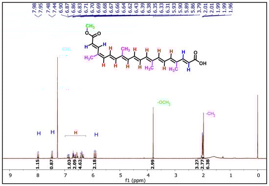 We identified the main signals related to the bixin functional groups by 1H NMR (Figure 6). These include signals from olefinic hydrogens at 7.96 ppm (J = 15.4 Hz, 1H); 7.48 ppm (J = 15.5 Hz, 1H), and 5.90 ppm (J = 15.5, 13.6 Hz, 2H), which correspond to the double bonds adjacent to the carboxylic acid and ester groups, respectively. Signals olefinic hydrogens of the aliphatic chain, with peaks ranging from 6.71–6.30 ppm (multiplets for 10 hydrogens). A singlet at 3.79 ppm corresponds to the three hydrogens of the methoxyl group of the ester group, and the signals from the 12 hydrogens of the CH3 groups of the aliphatic structure of the molecule that appear in the 2.01–1.96 ppm range. The signal from the hydrogen of the hydroxyl group corresponding to the carboxylic acid does not appear, likely due to isotopic exchange with the deuterated solvent.