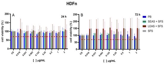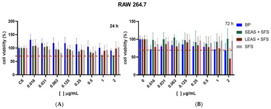 HDFn and RAW 264.7 cells were seeded in 96-well plates at a density of 1 × 104 cells/well and incubated at 37 °C in a 5% CO2 atmosphere to allow cell adhesion. After 24 h, freshly prepared SEAS + SFS, LEAS + SFS, PB, and SFS samples at varying concentrations (0.016 to 2 μg/L) were added to the cell cultures and incubated for 24 and 72 h. Following the incubation period, the treatments were removed, and 200 μL of MTT solution (0.5 mg/mL in culture medium) was added to each well. The plate was then incubated for an additional 4 h. After this, the supernatant was discarded, and 100 μL of DMSO was added to solubilize the formazan crystals. The optical density of each well was measured at 570 nm using a multi-scanner automatic reader (SpectraMax M3, Molecular Devices, San Jose, CA, USA).