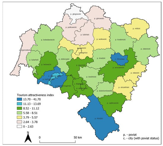 Tourist attractiveness of poviats (based on the tourist attractiveness index). Source: own elaboration based on [13].