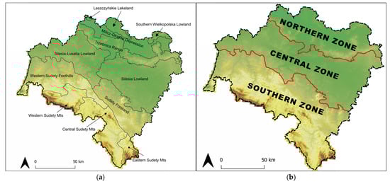 (a) The physico-geographical macro-regions of Lower Silesia; (b) zones demarcated for research. Source: own elaboration.
