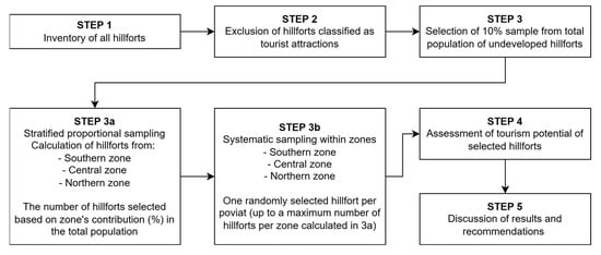 Within-zone selection was carried out by systematic sampling. The aim was to mitigate risks of spatially clustered selection, which could bias the results by occurrence of overrepresentation of one typological form of gord (e.g., potential concentration of one specific fortification type associated with tribal territory). It was assumed that the location of the selected hillforts would be relatively evenly distributed over the area of each zone (and the voivodeship), which would allow for the capturing of different types of hillforts in the assessment.
