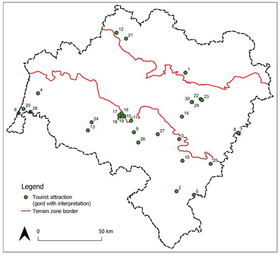 The inventory process identified 280 existing, confirmed, or presumed hillforts. Among these, 30 sites qualify as formal tourist attractions under N. Leiper’s definition [105], characterised by physical infrastructure such as educational signage enabling their recognition and identification in situ (Table 5). Among the identified heritage attractions (Figure 5), a pronounced spatial concentration is evident: 20 sites (67%) are located in the southern zone, 7 in the central zone, and only 3 in the northern zone. This distribution highlights significant disparities in tourism infrastructure development across the voivodeship’s geographical areas.