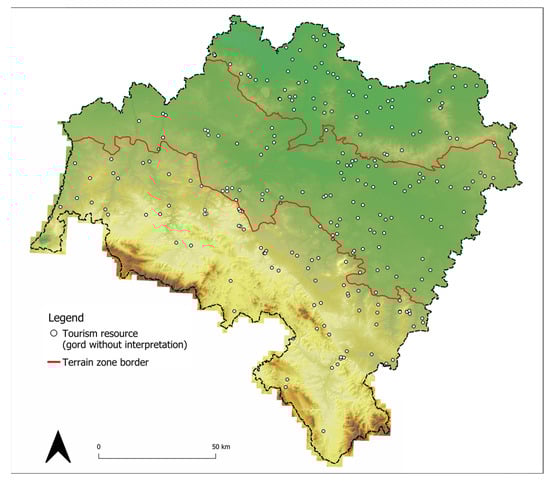 From the inventoried hillforts (Figure 4), in the next step, all established archaeological attractions were excluded, as these fell outside the present study’s purview. This task was carried out based on the analysis of results conducted as part of another, previous study focusing on archaeological attractions in the region [104]. As a result, the number of undeveloped hillforts in the entire Lower Silesian Voivodeship, distributed in all three terrain zones distinguished earlier, was finally obtained.