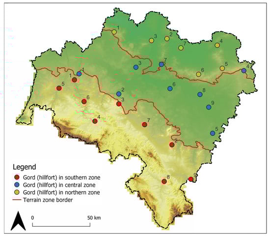 Hillforts are distributed across all the region, reflecting divergent settlement patterns from prehistory to the late medieval period, as well as terrain-dependent variations in fortification typologies. To address these spatial and morphological complexities, the voivodeship was subdivided into three zones based on terrain morphology, demarcated by physical–geographical macro-region boundaries (Figure 3):