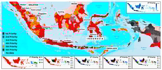 Urban spatial planning policies must consider access to clean water and stable electricity as critical components of a food-sensitive planning approach to developing food systems and urban design [59]. Therefore, spatial interventions and environmental design, implemented through policies and urban agriculture programs, can also serve as solutions to addressing food access disparities [60]. Moreover, each city’s Gross Regional Domestic Product (GRDP) needs to be analyzed for its impact on food security, as a high economic output does not guarantee high food security if its distribution is not spatially inclusive. Together with food security and vulnerability indices, this analysis provides a basis for analyzing urban spatial policies, enabling the identification of areas requiring attention in terms of basic infrastructure. Figure 3 illustrates the food security status of 514 districts/cities in Indonesia based on data from the National FSVA 2024 [58]. The map employs a color-coded system to indicate levels of food vulnerability, with categories divided into six priority scales. Red represents highly vulnerable regions (Priority 1), while green suggests highly resilient areas (Priority 6), with some regions showing more moderate levels of vulnerability.