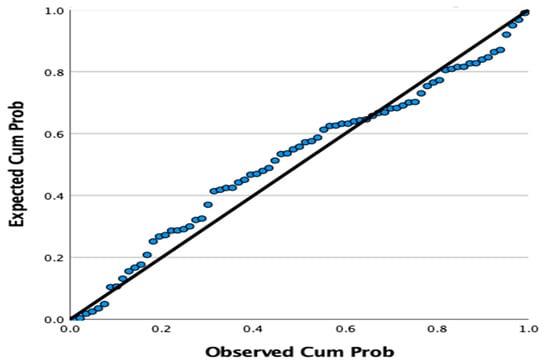 Based on the analysis presented in Figure 3, this study assessed the impact of the GRDP, food expenditures, access to electricity, and lack of clean water on food security in the seventy-five cities designated for smart city development in Indonesia. Before conducting the regression analysis, this study assessed multicollinearity among the predictor variables using the Variance Inflation Factor (VIF). A VIF value below 5 indicates an acceptable level of multicollinearity. As presented in Table 3, the VIF values range from 1.233 to 1.853, suggesting that multicollinearity is minimal (no indication of multicollinearity). The second diagnostic involved testing the normality assumption, which was evaluated through residual analysis. The results, illustrated in Figure 4, demonstrate that the residuals generally conform to a normal distribution. The normal distribution of residuals is crucial for ensuring that the parameter estimates remain unbiased. The third assumption examined was homoscedasticity, which is essential for the accuracy of standard errors and the reliability of hypothesis testing. Figure 5 presents a diagnostic plot that indicates consistent residual variance, confirming that the homoscedasticity assumption is satisfied. This analysis aims to determine whether these variables influence food security, thereby providing informed suggestions for policy implications in regions with food vulnerabilities.