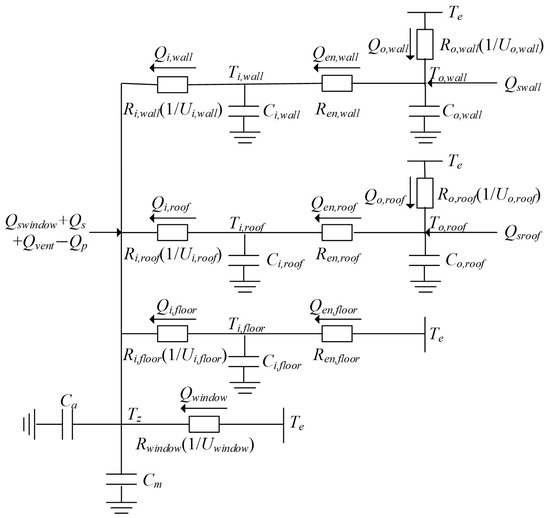The RC thermal network model was employed to model the building’s thermal load, as illustrated in Figure 2.