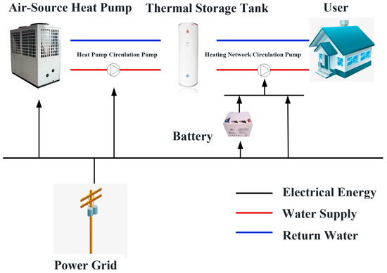 Taking the winter heating scenario of rural residences in northern China that have undergone electric heating retrofitting as an example, this study applies the aforementioned thermal storage electric heating system model. Based on the “Technical Specification for Thermal Storage Electric Heating Systems (10 kV and Below): Part 3,” it is recommended to integrate heat pump thermal storage to enhance the system efficiency of thermal storage electric heating when technically and economically feasible. The thermal storage electric heating system operates by converting electrical energy into thermal energy using a heat pump during off-peak electricity hours and storing it in a thermal storage water tank. During peak electricity hours, the stored thermal energy is released to meet user demand. This mechanism ensures a continuous supply of hot water, and even under limited power supply conditions, the thermal energy stored in the water tank can still meet the basic needs of users. Using a typical heat pump–thermal storage water tank–user model as an example, the energy consumption characteristics of a single thermal storage electric heating unit are analyzed through simulation. The structural diagram of the thermal storage electric heating unit system is shown in Figure 3. The air-source heat pump heating system consists of an air-source heat pump, a thermal storage water tank, radiators, a heat pump circulation pump, a heating network circulation pump, a battery, and heating pipelines.