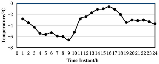 The example considers a typical day during the heating season in Tianjin, with the outdoor temperature profile shown in Figure 4. To better align with real-world scenarios, it is assumed that users will utilize the thermal storage function of the electric heating system to modify their electricity usage patterns based on the impact of time-of-use (TOU) electricity rates. Therefore, an energy consumption strategy that optimizes economic benefits is generated, with the objective function given by Equation (39) and the constraints given by Equations (31)–(33).