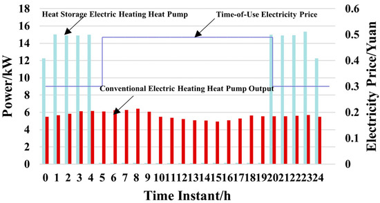 Figure 5 shows the optimized operation results of the single thermal storage electric heating system. Through simulation analysis, it is found that compared to traditional electric heating, the energy consumption characteristics of users with thermal storage electric heating exhibit significant changes in their temporal distribution. From the figure, it is evident that the energy consumption peak of the thermal storage electric heating system is concentrated in the time periods of 0–4 h and 20–23 h, while the energy consumption load is significantly lower during the periods of 4–9 h and 17–24 h. This change in the temporal distribution is primarily due to the operational strategy of the thermal storage electric heating system, which takes advantage of the lower electricity prices at night to store heat and then releases the stored heat during the higher electricity price periods during the day. Specifically, the figure shows that from 0 to 4 h, the thermal storage electric heating device operates at a high heating output. From 4 to 9 h, the heating output of the device significantly decreases, indicating that the device is mainly releasing the stored heat during this period. From 20 to 23 h, the heating output increases again, suggesting that the device is preparing to store heat for the night. Figure 5 also clearly reflects the impact of time-of-use (TOU) electricity pricing policies on the operation of the thermal storage electric heating system. During the low-price periods of 0–4 h and 20–23 h, the heating output of the thermal storage electric heating system significantly increases. Conversely, during the high-price periods of 4–9 h and 17–24 h, the heating output significantly decreases. This operational strategy effectively utilizes the low-cost off-peak electricity at night. It also avoids running the system during the higher electricity price periods during the day, thereby minimizing electricity expenses and achieving the goal of economic optimality.