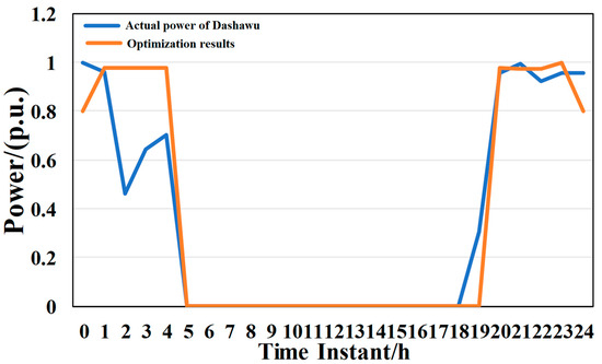 Figure 6 compares the actual power consumption and the optimization results of the Dasha Wo thermal storage electric heating station, which serves as a demonstration site. To validate the effectiveness of the proposed model for the energy consumption characteristics of thermal storage electric heating systems, we obtained the data from the electric boiler of the Dasha Wo demonstration site and normalized it. We then compared it with the optimization results generated by the proposed model. From Figure 6, it is evident that under the guidance of time-of-use (TOU) electricity pricing, the actual power consumption curve of the Dasha Wo demonstration site aligns well with the optimization results. Both curves show that the electric boiler is activated during the low-price night period (20–6 h) and shut down during the high-price day period (7–19 h). This clearly reflects the operational strategy of the thermal storage electric heating system to store heat during low-price periods and supply heat during peak periods. This operational mode effectively concentrates the load during the low-price night period, reducing overall electricity costs and benefiting the stability and balance of the power grid. However, there is a notable difference in the curves between 1 and 5 h. This discrepancy is due to the larger thermal storage tank capacity and relatively smaller electric boiler power specified in the optimization model. Therefore, during this period, the electric boiler operates at full load to meet the heat storage demand, resulting in a higher peak in the actual power consumption curve. This phenomenon highlights the importance of carefully designing and optimizing the thermal storage electric heating system, considering the matching relationship between the thermal storage tank capacity and the electric boiler power to ensure the system’s stability and economic efficiency in actual operation.