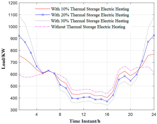 Figure 7 illustrates the impact of integrating thermal storage electric heating systems at different proportions on regional load variations. The four curves represent the load profiles without thermal storage electric heating and with 10%, 20%, and 30% integration of thermal storage electric heating, respectively. Comparative analysis reveals that in the absence of thermal storage electric heating, the load curve exhibits a typical “double peak” characteristic, with distinct load peaks occurring during the daytime and evening, while the nighttime load remains relatively low and stable. As the proportion of thermal storage electric heating increases, the daytime load gradually decreases, and the curve tends to flatten, particularly from midday to evening. For instance, at a 30% integration level, the daytime peak load decreases by 22% compared to the scenario without thermal storage electric heating, indicating that thermal storage electric heating effectively alleviates daytime grid pressure. Simultaneously, the nighttime load significantly increases, forming a new load peak during the early morning hours. For example, at a 30% integration level, the nighttime load rises by 63% compared to the scenario without thermal storage electric heating, reflecting the characteristic of more thermal storage electric heating devices operating intensively during off-peak electricity pricing periods. Overall, as the proportion of thermal storage electric heating increases, the load curve transitions from a “double peak” to a “single peak” pattern, demonstrating that thermal storage electric heating optimizes regional load distribution through a “peak shaving and valley filling” operational strategy. This contributes to mitigating peak grid pressure during the daytime and enhances the economic efficiency and stability of grid operation.