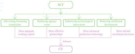 The improvement in enterprise CU cannot be achieved without financial support. If enterprises have deficiencies in productive capital and innovation investment, the expansion of their production scale and sales channels is limited [21]. Therefore, solving the problem of enterprise financing shortage is the key to improving CU. The following are a few major factors constraining enterprise financing: first, enterprises may not be able to meet the bank’s lending requirements due to insufficient collateral assets, lack of effective guarantees, or information asymmetry, thus leaving the enterprise’s financing needs unfulfilled; second, the cost of external financing for enterprises is generally high, and relying solely on the enterprise’s own financing ability cannot meet the enterprise’s innovation. Lastly, the information asymmetry between financial institutions and businesses makes it more difficult to assess their inherent worth and possible dangers, which makes enterprise financing even more challenging. SCF is a new financial tool that helps SMEs with their funding challenges. In the supply chain, the model links high-end and low-end businesses. They integrate resources and create a secure, long-term strategic partnership with core businesses. Financial institutions offer comprehensive credit and lending services to businesses in the same supply chain based on the needs of core businesses. This practice reduces the cost of screening enterprises by financial institutions and improves the accessibility of enterprise financing. By leveraging SCF, third-party logistics providers are able to monitor the real-time logistics activities of firms within the supply chain. This facilitates more effective oversight by financial institutions of corporate operations and potential risks, thereby mitigating information asymmetry and further easing the financing constraints faced by enterprises. Based on the above analysis, this paper proposes the following: