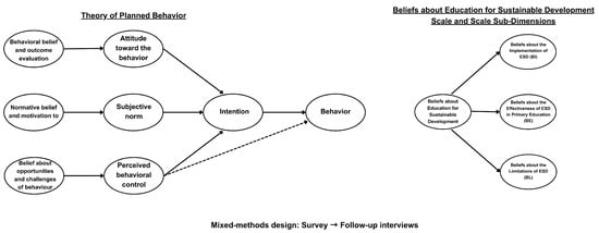 The main aim of this study is to identify teachers’ belief levels regarding ESD, to explain the factors influencing these beliefs, and to reveal teachers’ suggestions for improving the quality of ESD. In alignment with these objectives, the TPB was adopted for its capacity to analyze the belief structures that shape teachers’ behavioral intentions and to evaluate the relationships among these structures. Additionally, the theory serves as a robust theoretical tool for understanding the effects of various socio-demographic variables (such as gender, age, teaching field, and education level) on the belief dimensions. TPB not only allows for the description of teachers’ current belief levels but also offers insights into the likelihood of these beliefs translating into actual behaviors and the factors influencing this process. Figure 2 presents the conceptual framework summarizing the model of the Beliefs about Education for Sustainable Development scale based on the Theory of Planned Behavior, along with the mixed-methods research design employed in this study.