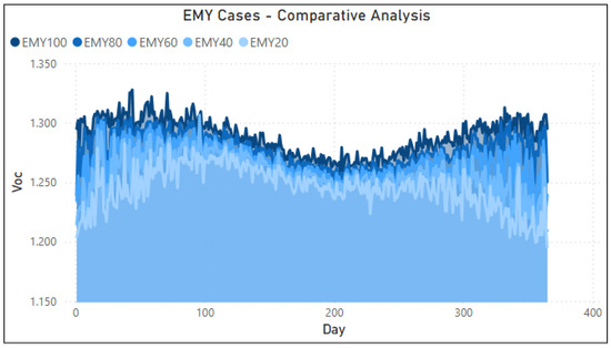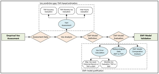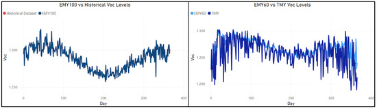 It is important to note that all Voc calculations in this study followed the same model, represented by Equations (1)–(3), which obtained Voc levels from meteorological conditions. This approach eliminates any additional error that could arise from using different Voc models, while ensuring consistency in the analysis. Moreover, it allows other researchers to replicate the study using alternative models at their discretion, as long as the same model is consistently applied to estimate Voc under the different scenarios considered (historical data, TMY, and EMY).