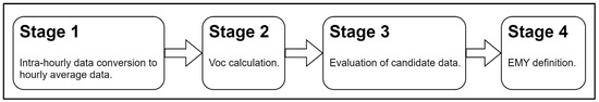 - Stage 2—Voc calculation. Tcell and Voc values are calculated based on the hourly weather data and PV module electrical characteristics, following Equations (1)–(3). Thus, each day’s data with hourly precision, including the weather parameters, Tcell, and string Voc results (which also depends on string size), will be treated as a candidate to make up each day of hour data of the new EMY (Figure 4).