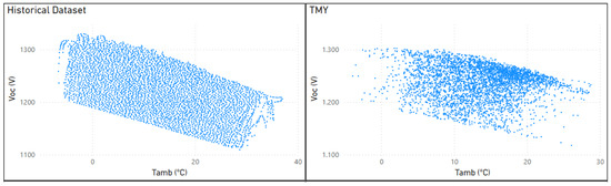 The inaccuracy between TMY and historical datasets is graphically represented with scatter plots of Voc results. As a reference, this comparative analysis for the UK site is provided in Figure 7: