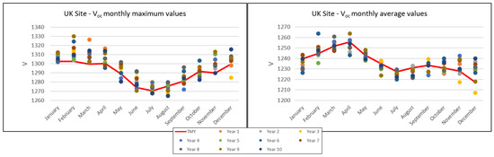 The monthly evaluation is based on Voc errors in a month-to-month evaluation, comparing Voc levels for each month of the historical dataset against the value for the same month of the TMY dataset, maximum and average deviations are obtained. As first step, Figure 8 provides the graphical representation of these monthly Voc levels for the UK site, in which TMY values are represented through the red line, and the different years of the equivalent historical dataset through each colored point: