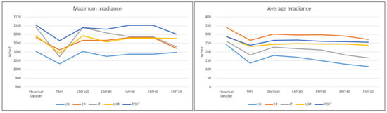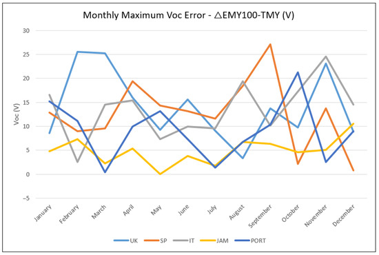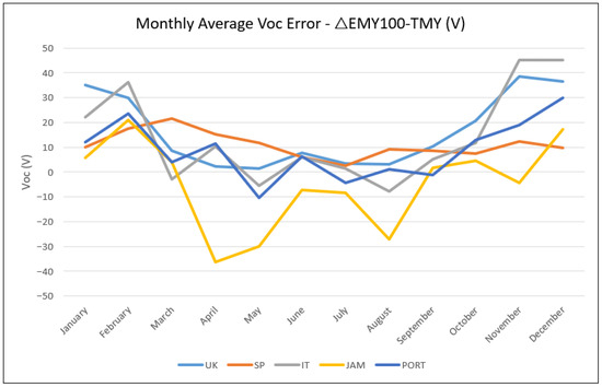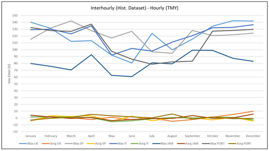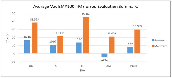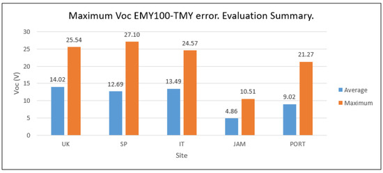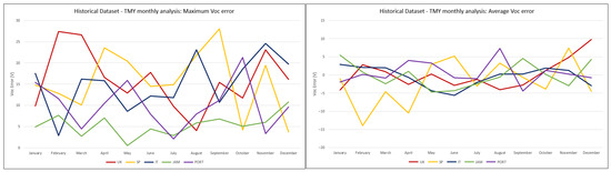 As shown in Figure 8, the monthly average and maximum Voc values obtained from the TMY follow the dispersion offered by the historical data for each month, proving the voltage correlation between the TMY and the historical dataset. However, relevant discrepancies between historical and TMY Voc values are obtained. This error, which can lead to a relevant error in the maximum voltage prediction, is represented in Figure 9 for the different sites.
