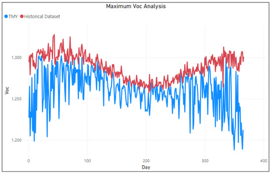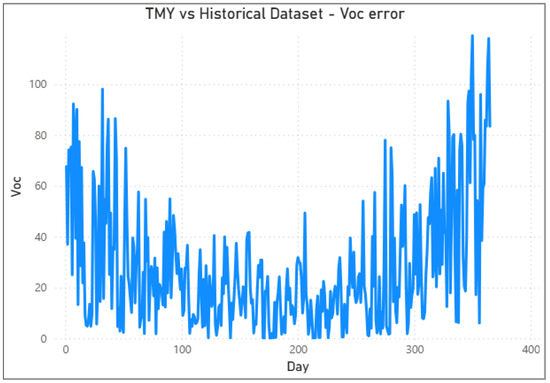 This analysis focuses on the voltage differences between inter-hourly historical data and the associated TMY dataset. Using Equation (3), Voc is calculated for both datasets, and a comparative analysis is performed to quantify the voltage error introduced by relying on TMY. This highlights the impact of using TMY-derived predictions, given the discrepancies found between TMY and the historical data from which it is constructed.