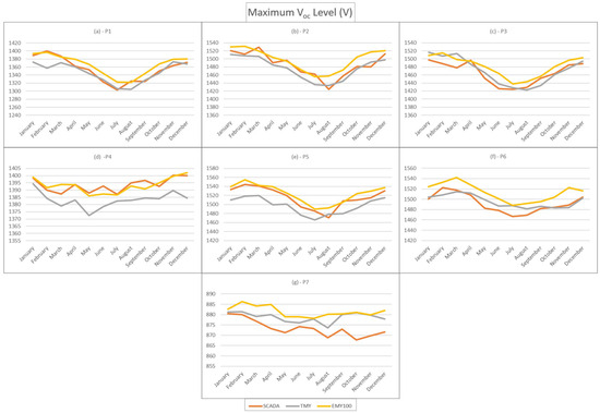 The analysis compares the Voc levels estimated by the TMY and EMY models with reference Voc values derived from each project’s SCADA for the year 2023. It is important to note that Voc is not directly monitored in commercial PV systems, as voltage measurements are typically taken at the inverter level, and inverters are inactive under open-circuit conditions. Therefore, the reference Voc values are calculated, using weather data collected by on-site weather stations and sensors, applying the same methodology (Equations (1)–(3)) used for the TMY and EMY-based estimations.
