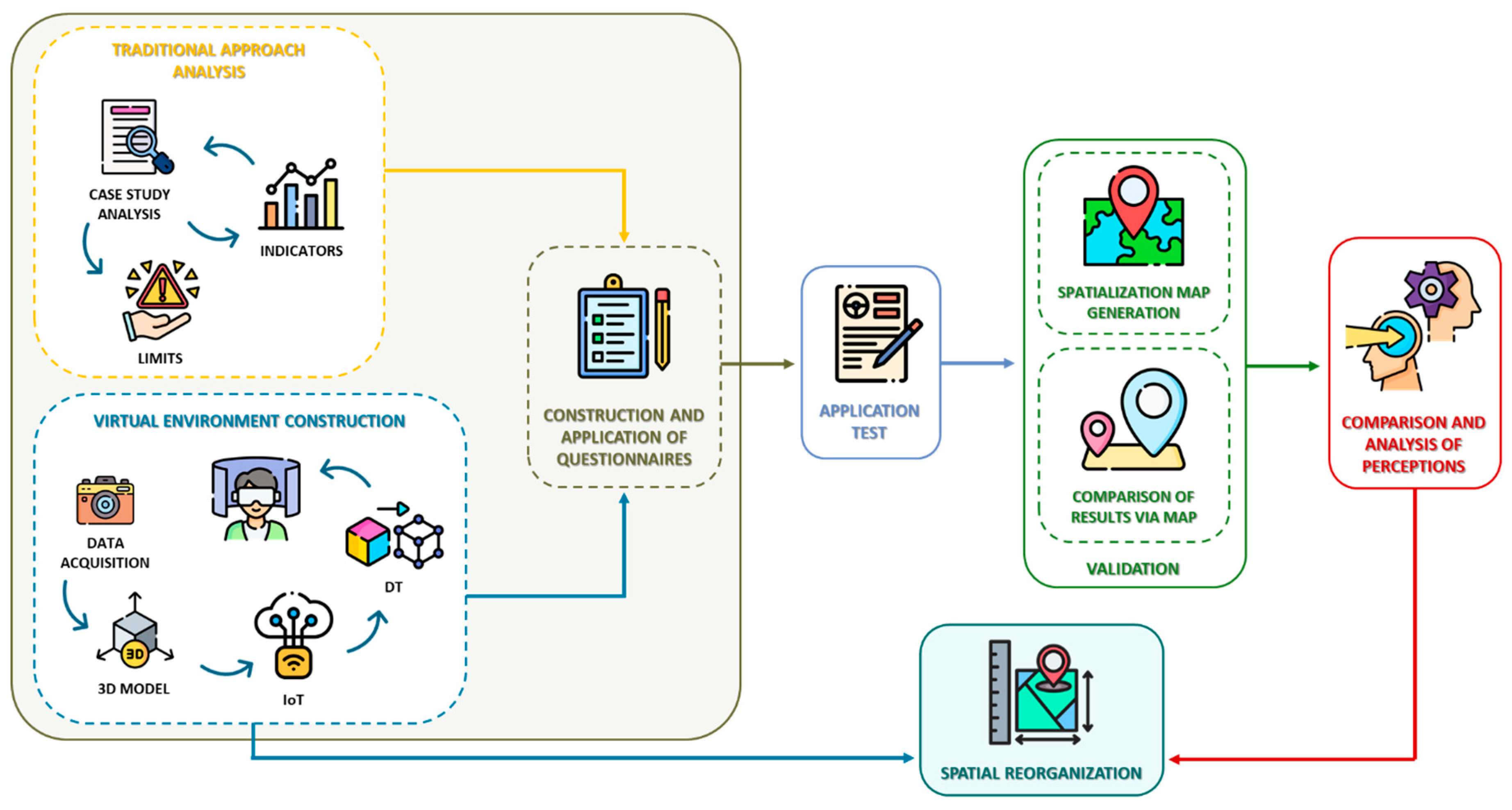 Finally, new data are acquired from the real and/or virtual experience, which may cover several aspects of the same case study, and from these, it is possible to create new environments or make changes based on impressions, evaluations, and critical points identified by the users, allowing them to simulate the appropriate context according to the feedback obtained. Once the data had been collected from the virtual environment, they were used both to validate its creation and correspondence with the real twin, and to obtain feedback to be used in the design process.