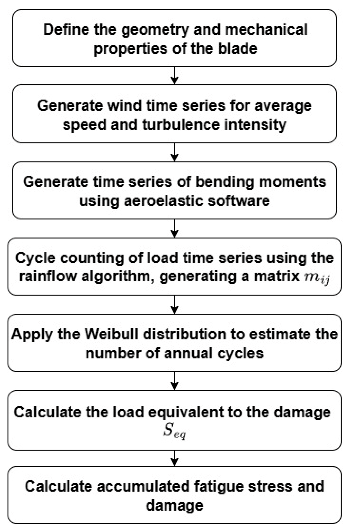 - The estimated blade lifespan meets the design requirement with a duration of over 20 years for the wind field generated, according to data from the Wind Technology Regional Center (CERTE) Meteorological Station. Therefore, only the design load case under normal operation according to the IEC 61400-2 standard is considered and analyzed. This standard is specifically intended for small-scale wind turbines. The programmed algorithm estimates the equivalent load and the damage caused to each wind speed interval in the generated field.