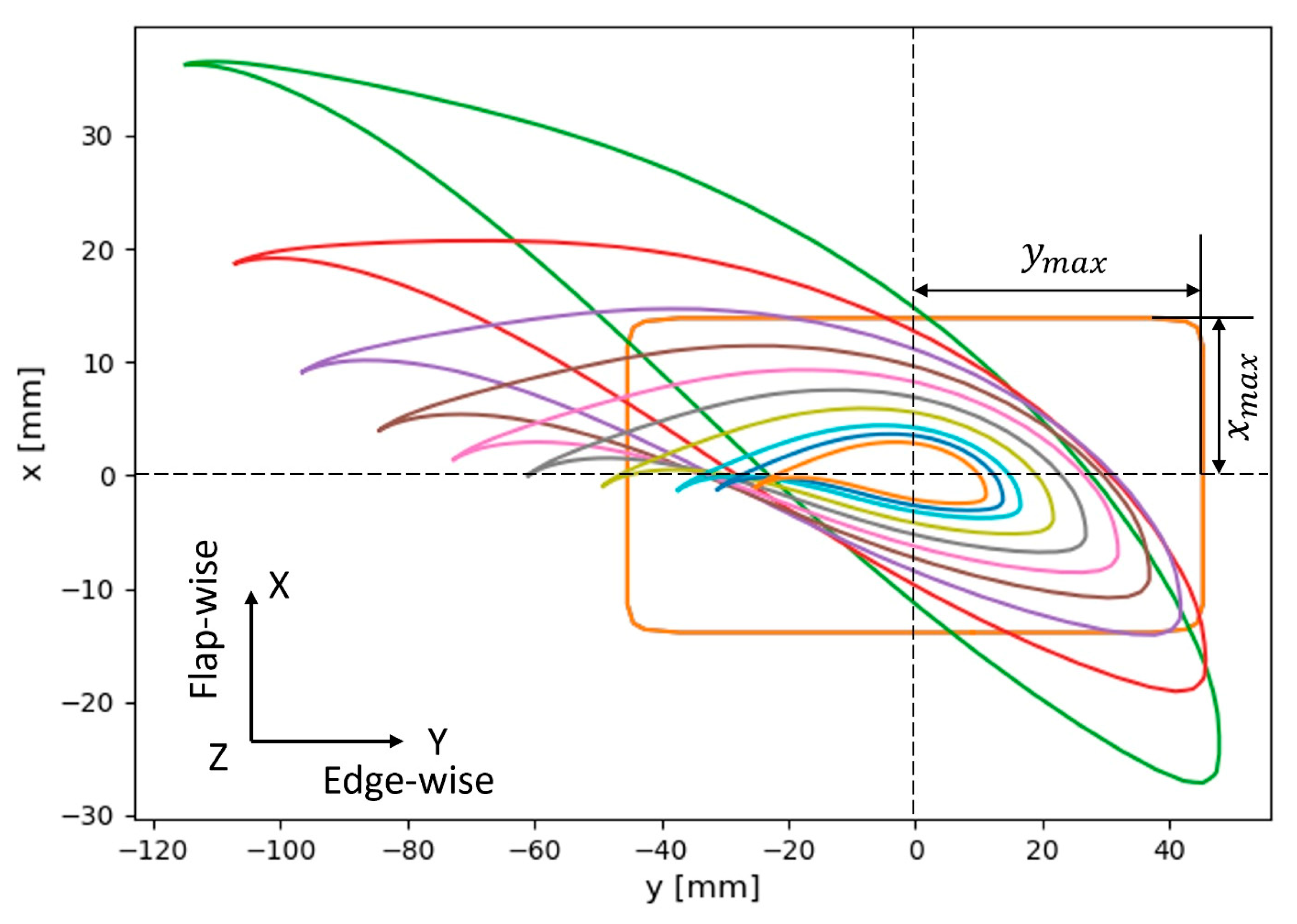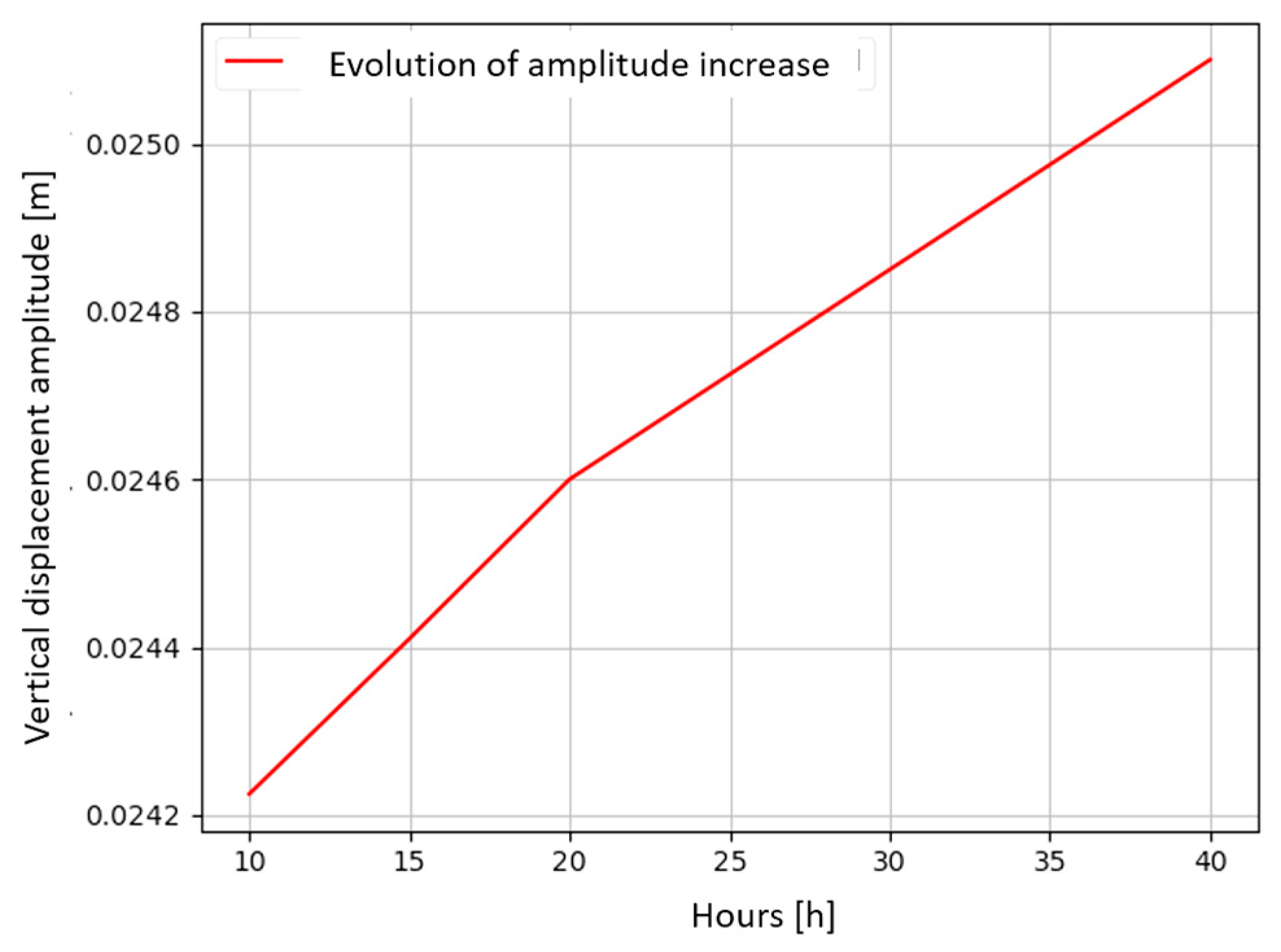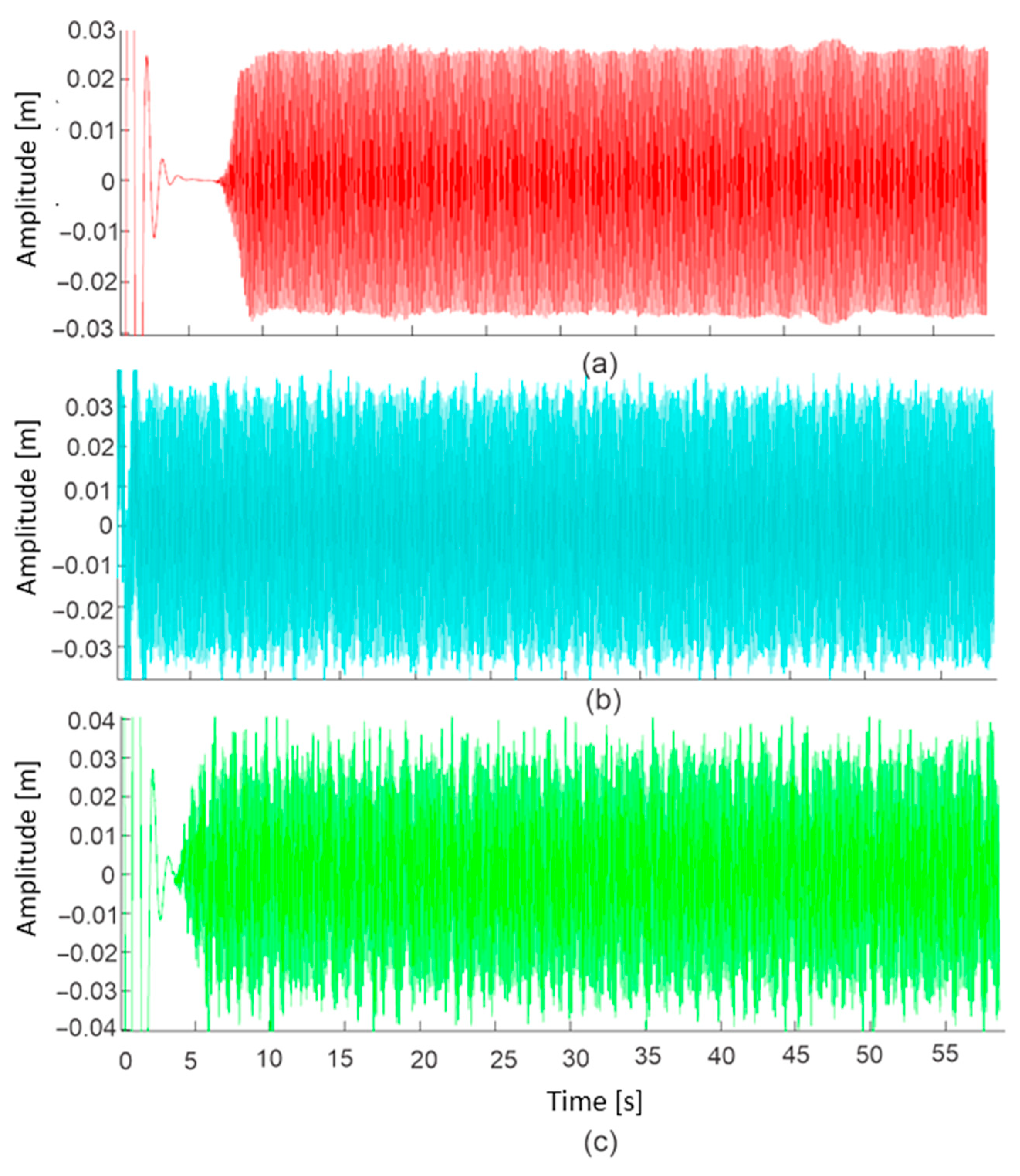 - The approximation of the target load with the experimental test was determined through trial and error, mainly due to the location of the excitation device. For the simulation, the device was placed at 62%, while for the experimental test, it was 75% concerning the radius, resulting in a 13% difference. What this part of the study actually sought to do was to experimentally replicate the same amplitude range at the tip of the blade as seen from a theoretical point of view; this is because the bending moment could not be measured in the experimental tests. The variation in the position of the load could be affected in the same way by the definition of stiffness, since this parameter depends on the geometric characteristics and elastic properties of the material. Seen from another point of view, the theoretical analysis was used to approximate the application of the oscillating load.