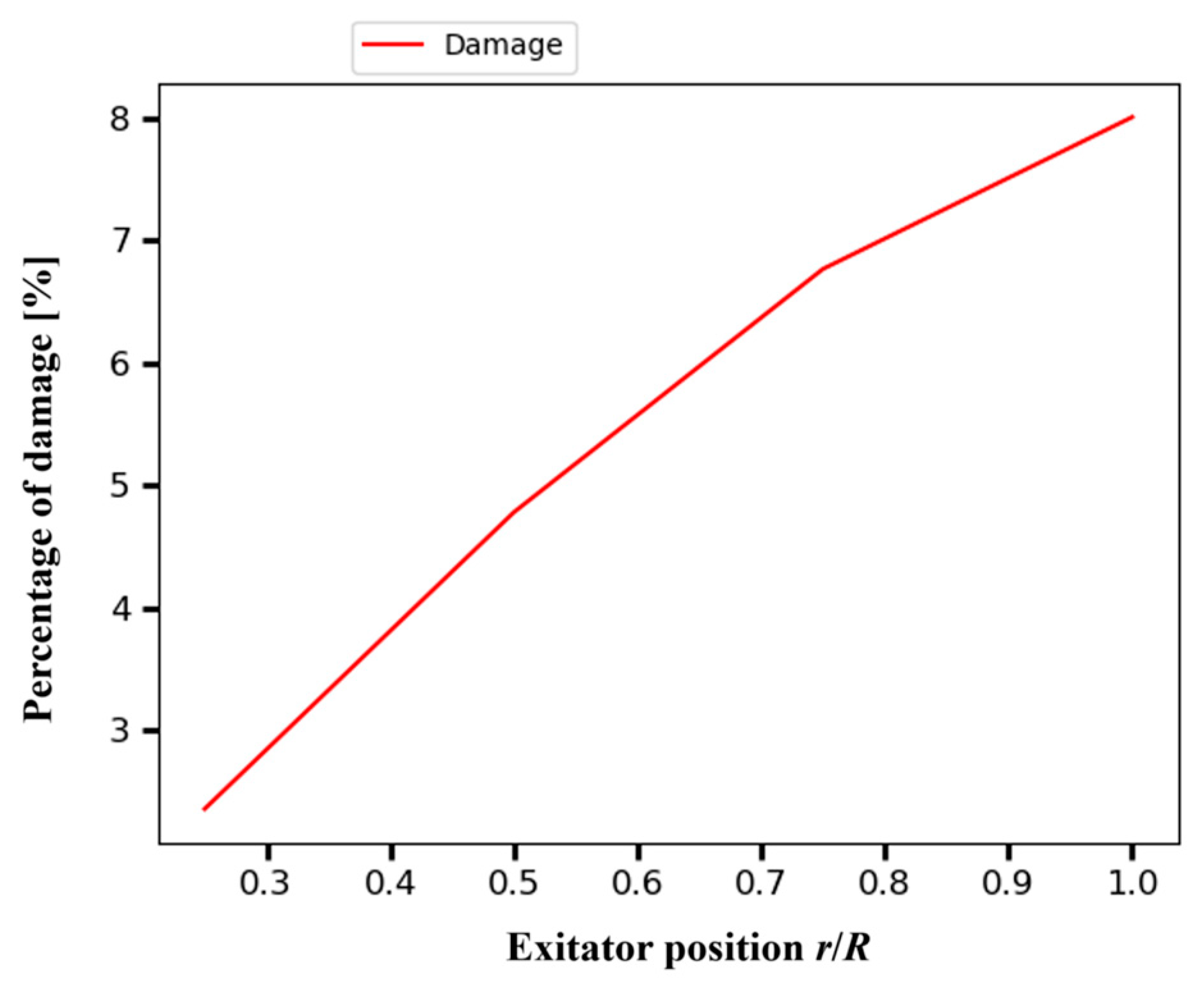- With the chosen input parameters for the excitation system in dynamic simulations for both out-of-plane and in-plane directions, the equivalent damage load is replicated. It is approximately 45% of the blade length in the areas closest to the root, with a tolerance of 10% in the error. Therefore, it is considered possible to reproduce the damage caused over a 20-year lifespan for the critical attachment zone on the blades.
