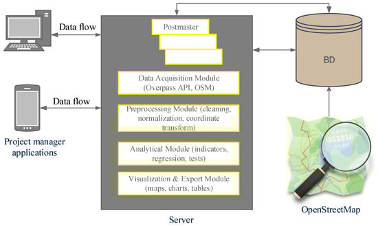 To accelerate the identification and management of transport infrastructure projects, the proposed system model also supports the use of web-based and mobile applications. These tools empower project managers and local planners to interactively collect, validate, and visualize data on infrastructure characteristics in real time. Figure 1 illustrates the conceptual architecture of the proposed data collection system, highlighting its functional components, data flows, and integration points with external sources such as OSM.