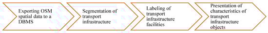The resulting data frame, composed of a structured set of spatial vectors, enables the visualization and analysis of key characteristics of transport infrastructure elements. These include road classifications, bridge locations, river crossings, pedestrian paths, and transportation routes, all of which are represented within detailed maps of the selected settlements. The stages involved in presenting and interpreting spatial data on road infrastructure are illustrated in Figure 2.