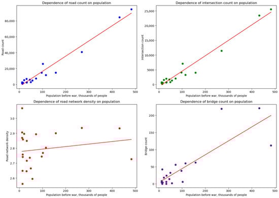 Interpretation of Core Findings. This study presents a novel spatial-data-driven model for planning post-war transport infrastructure underpinned by sustainability principles. The linear relationships identified, such as the rise in road and intersection counts per 1000 residents, provide quantitative benchmarks that enhance recovery planning. For example, Equation (8) shows an average of 191 new road segments per additional 1000 inhabitants, while Equation (9) suggests approximately 52 additional intersections. These findings enable precise estimations of recovery needs and support efficient resource allocation in data-scarce, war-affected regions.